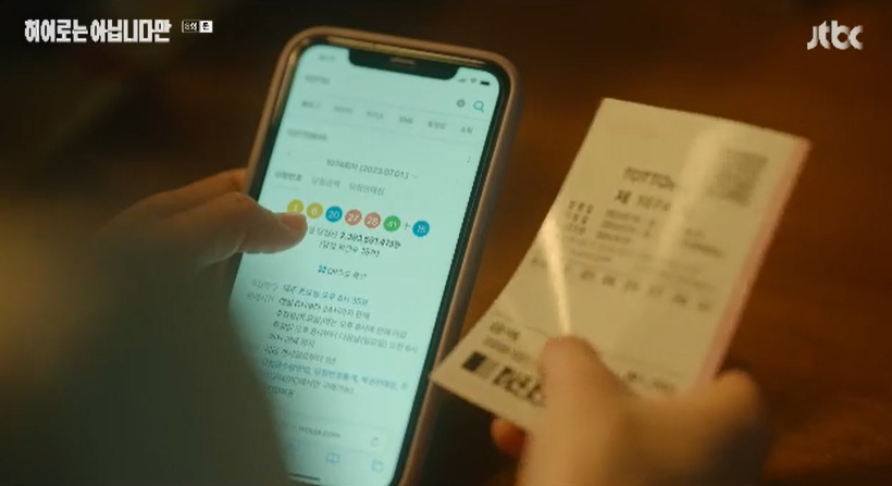 찜질방으로 돌아와 귀주가 시킨대로 일찍가서 적어준 대로 복권을 산 다해는 복권번호를 맞춰보고 1등이 당첨되자 놀랍니다.