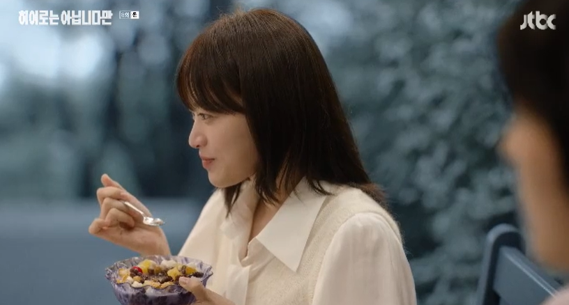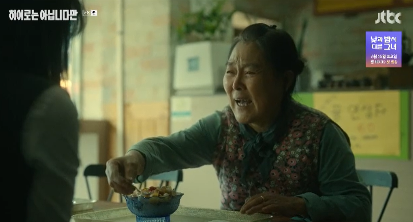 다해가 말했던 인생 팥빙수는 화재사고 이후 배가고픈 다해가 베이커리에서 빵을 훔쳤는데, 그걸 안 낯선 아줌마가 다해의 빵값을 계산해주고 화재사고로 놀랐겠다며 위로해주며 사줬던 팥빙수 였습니다. 담담히 사연을 귀주에게 이야기 해주는 다해.