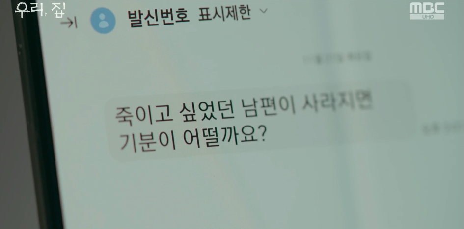 사강은 자신도 영원처럼 최검사 49제때 이상한 문자를 받았다며 보여줍니다. 최검사를 자신의 소설내용처럼 죽이 자신에게 뒤집어 씌우려는 사람이 한짓같다는 사강.