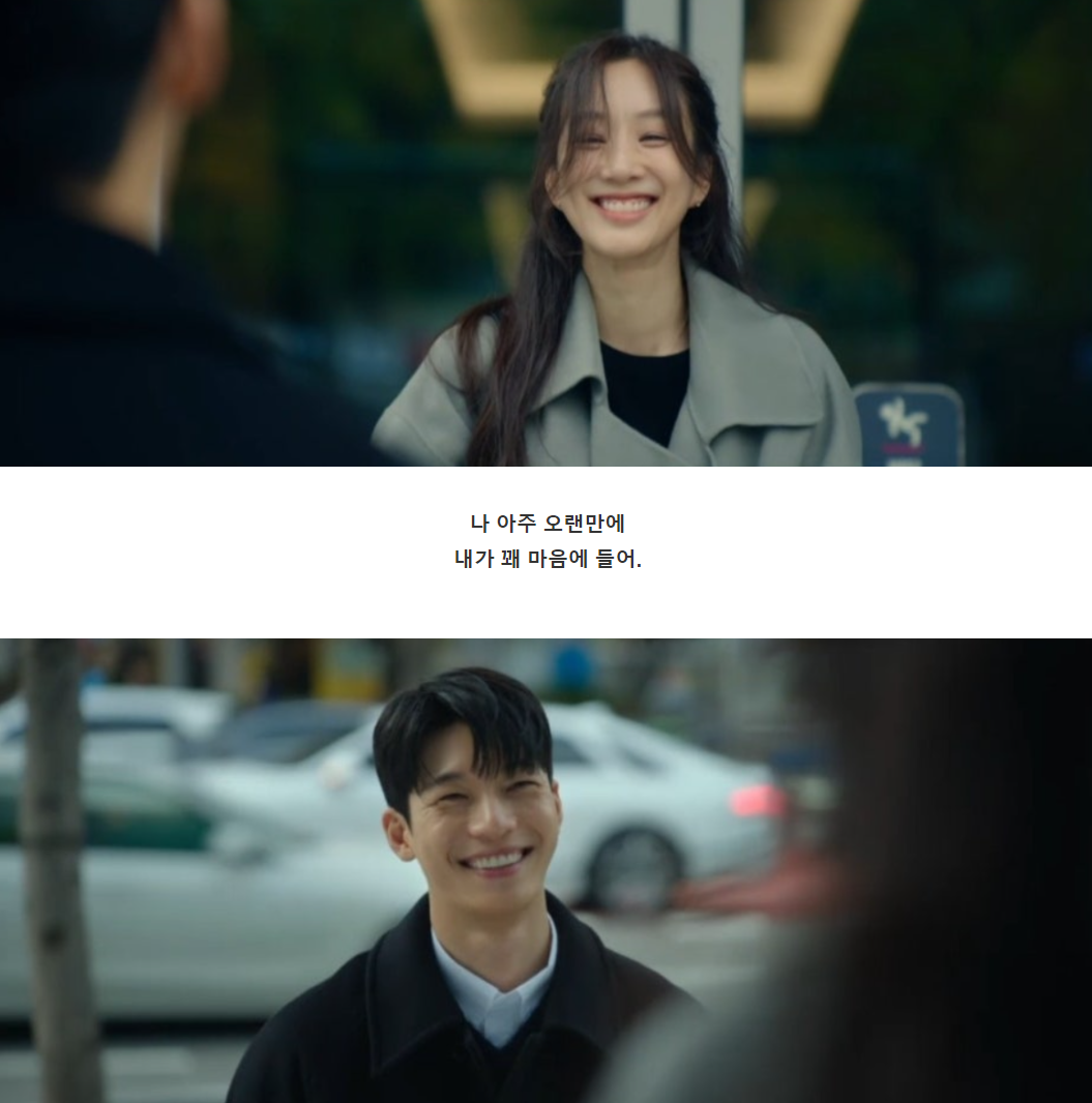 최선국어를 나온 혜진에게 마침 준호가 전화를 걸고 두사람은 신호등을 마주보고 만나게 됩니다. 엄마가 싸준 김밥을 출근전에 혜진과 함께 먹고 싶었다는 준호는 혜진의 기분이 좋음을 캐치하고 무슨일이냐고 묻습니다.