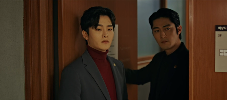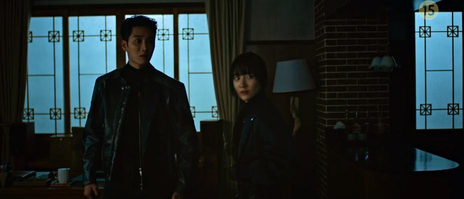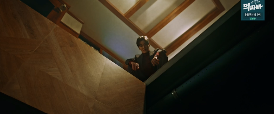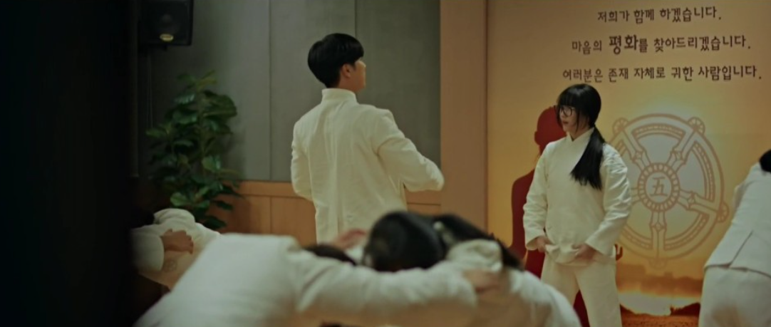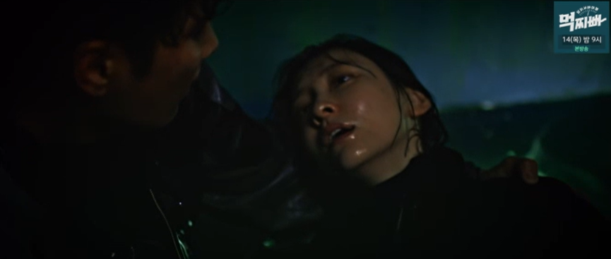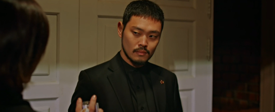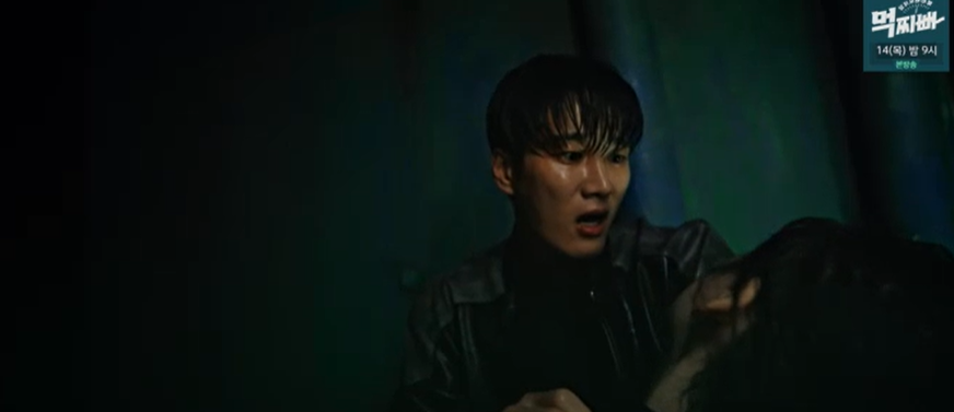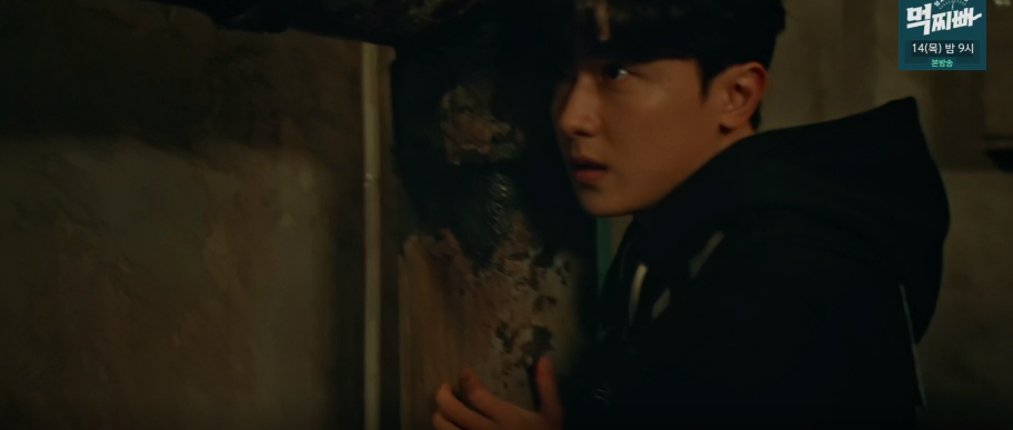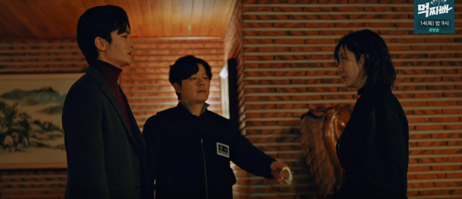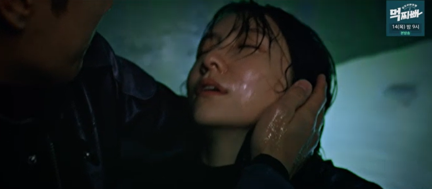 사이비 교주 보리의 사택에 잠입했다가 마주친 강현과 이수. 인기척이 들려 두사람은 발각되기 직전 인데 다행히 강현은 숨고 이수가 배가고파 식당을 찾는 중이였다며 능청스럽게 연기를 해 보리 부하를 속여 위기를 넘깁니다.