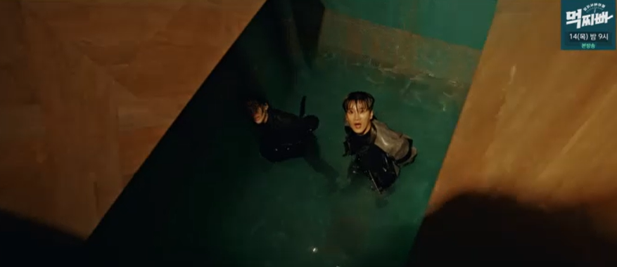 이미 강현과 이수의 신분을 모두 알고 있는 보리 신우혁은 손발이 묶인 강현과 이수를 자신의 사무실 한복판에 만들어진 비밀 수조로 떨어뜨려 버립니다.