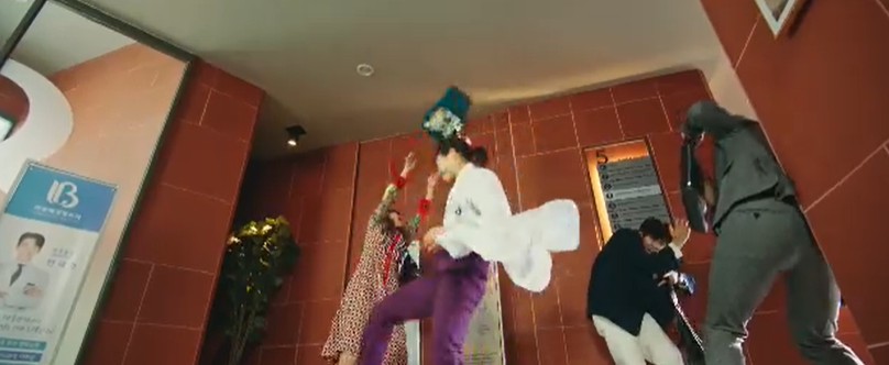 막무가내로 쓰레기통을 들고 횡포를 부리는데, 지나가던 홍란이 이를 보고 발차기로 제압해 줍니다.