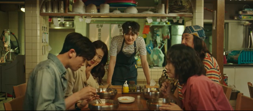 모두가 감동했는데 뒤늦게 도착한 정우가 밀면을 먹고는 적나라한 평으로 감동을 파괴해서 결국 밀면을 먹던 정우는 하늘의 손에 이끌려 쫒겨나다싶이 옥상으로 올라옵니다.