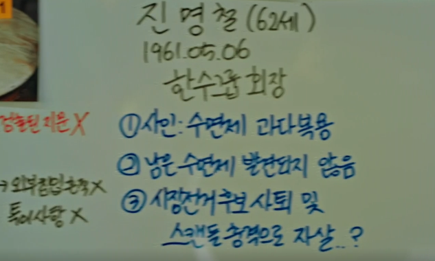 강현은 이수의 아버지 진회장과 친엄마 김선영 모두 사인이 동일한데 미심쩍다고 하고, 수사팀은 둘의 죽음으로 가장 큰 이득을 본 조희자와 승주를 용의선상으로 올립니다.