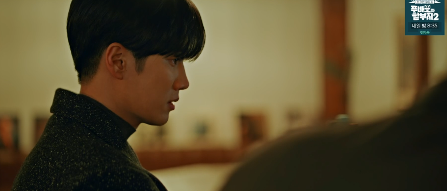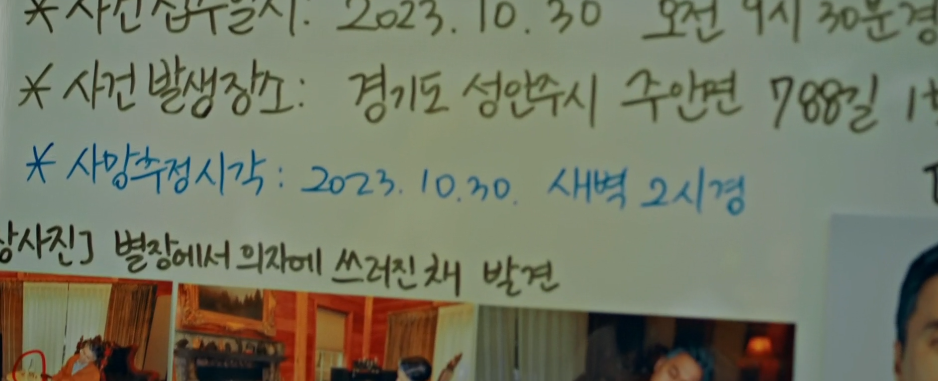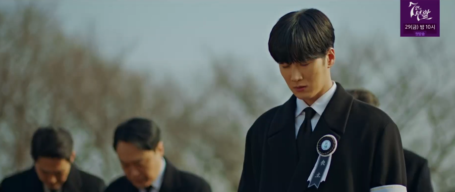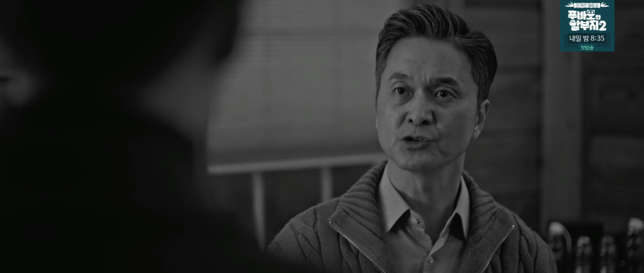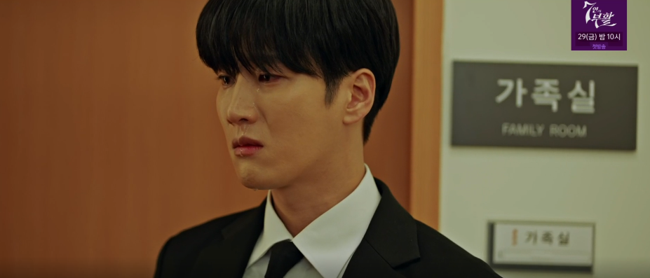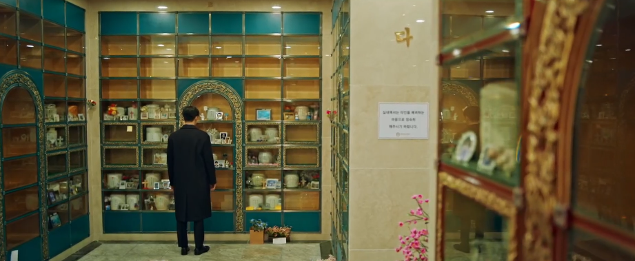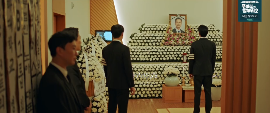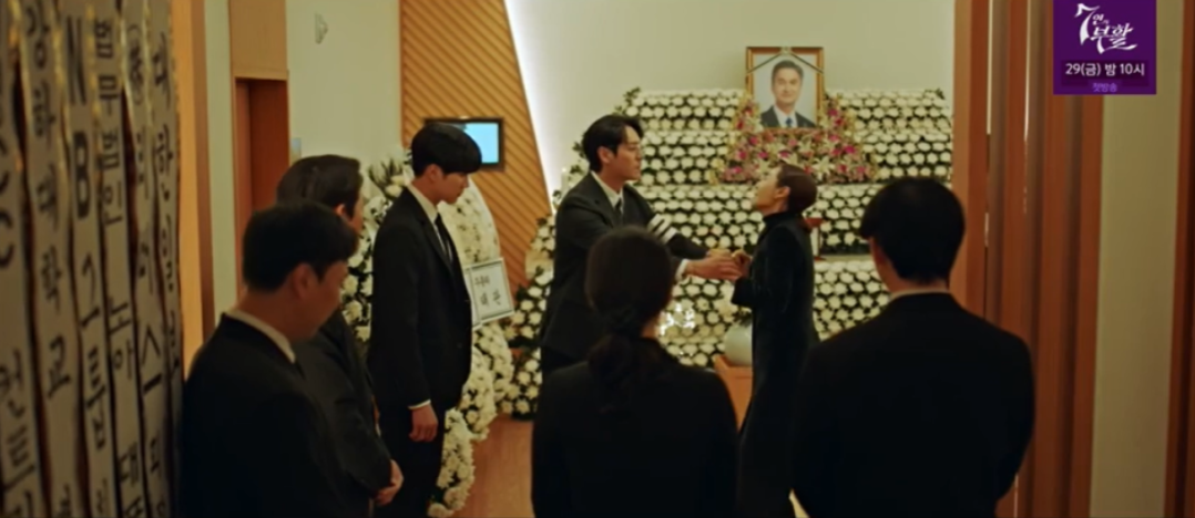 장례식장으로 온 이수는 아버지의 영정사진을 보면서 슬픔과 충격에 잠겨 있습니다.