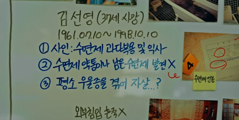 이수 엄마의 수사기록을 가지고 아버지를 찾아 서장실에 온 강현은 현장에 이수엄마와 아머지의 현장 모두에서 남은 약이 발견되지 않은게 이상하다고 이야기 합니다.