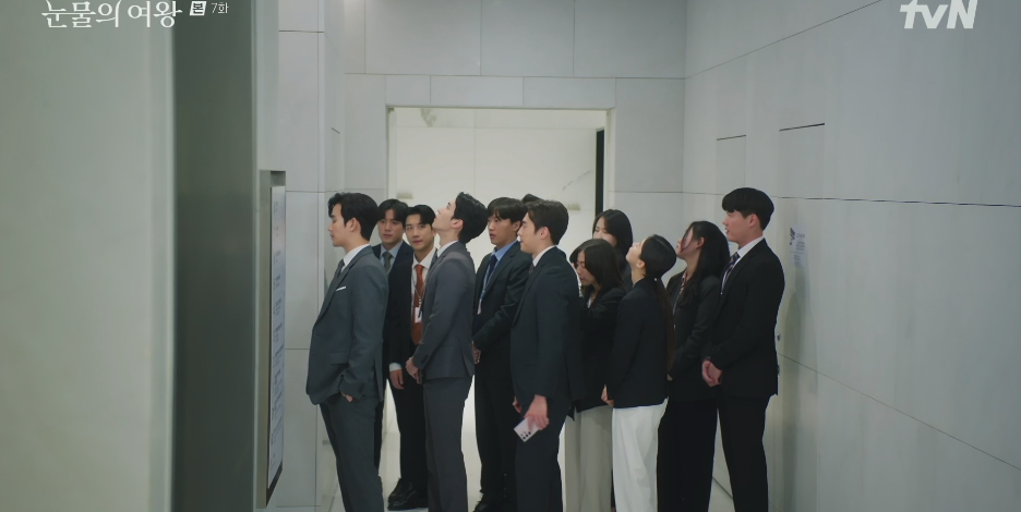 결국 사장인 해인승.. 해인은 엘레베이터를 타고 내려가고, 남은 법무팀은 씁슬하게 계단으로 내려가기로 합니다.