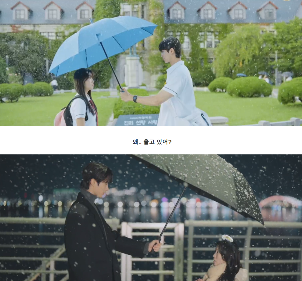 자 비를 맞고 있는 임솔에게 류선재가 다가와 우산을 씌워주고, 임솔은 2022년도에 자신에게 우산을 씌워줬던 류선재를 떠올리면서 1회는 끝이 납니다.