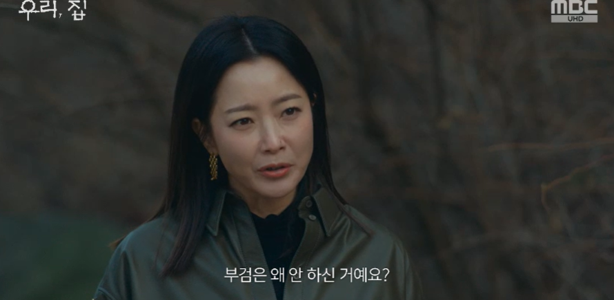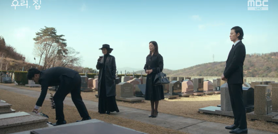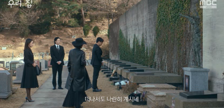 예배식으로 49제를 한다며 차린것 없이 홍사강이 와인잔 하나 들고있는데 시누이가 와서 재산타령을 합니다. 묘자리가 좋아보인다며 가족묘로 만들어달라는 시누이에게 최검사가 바람핀 수많은 여자들한테 말하라며 들은척도 안하고 가버립니다.